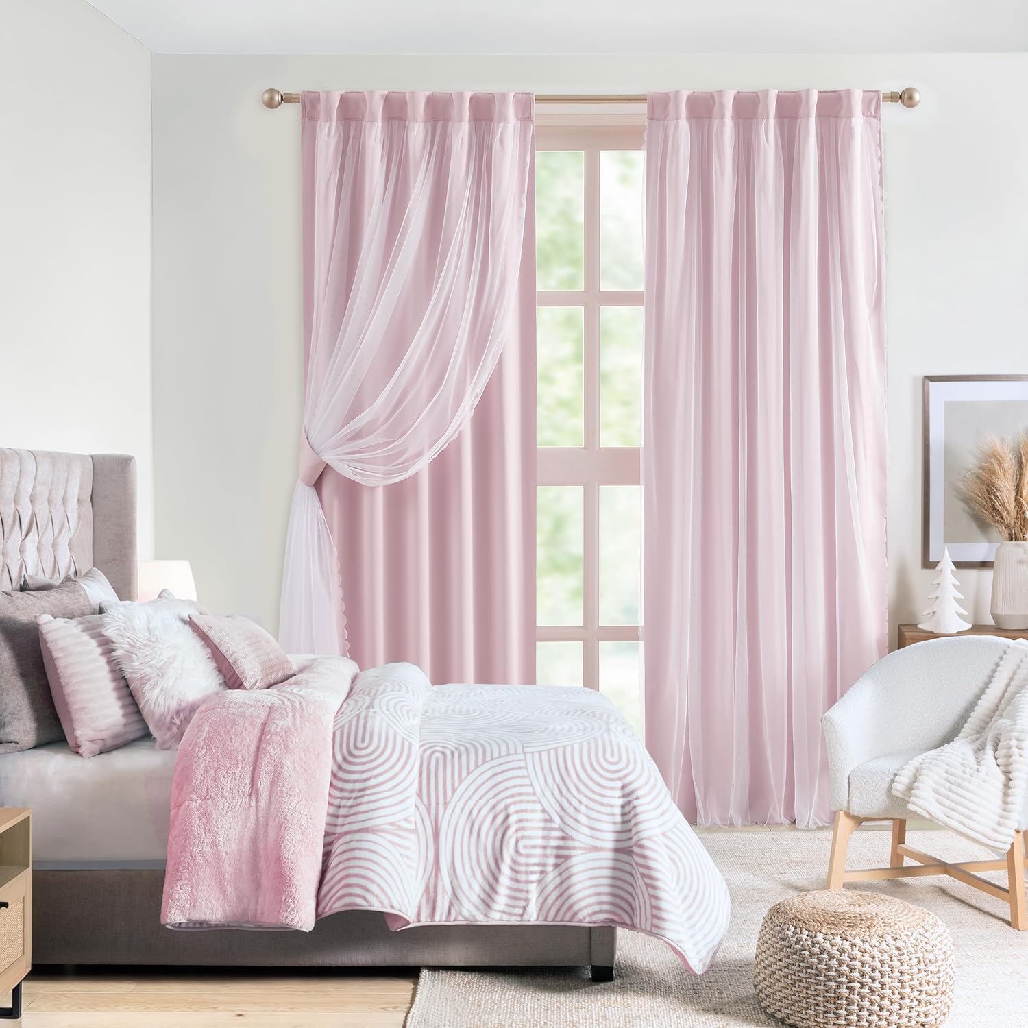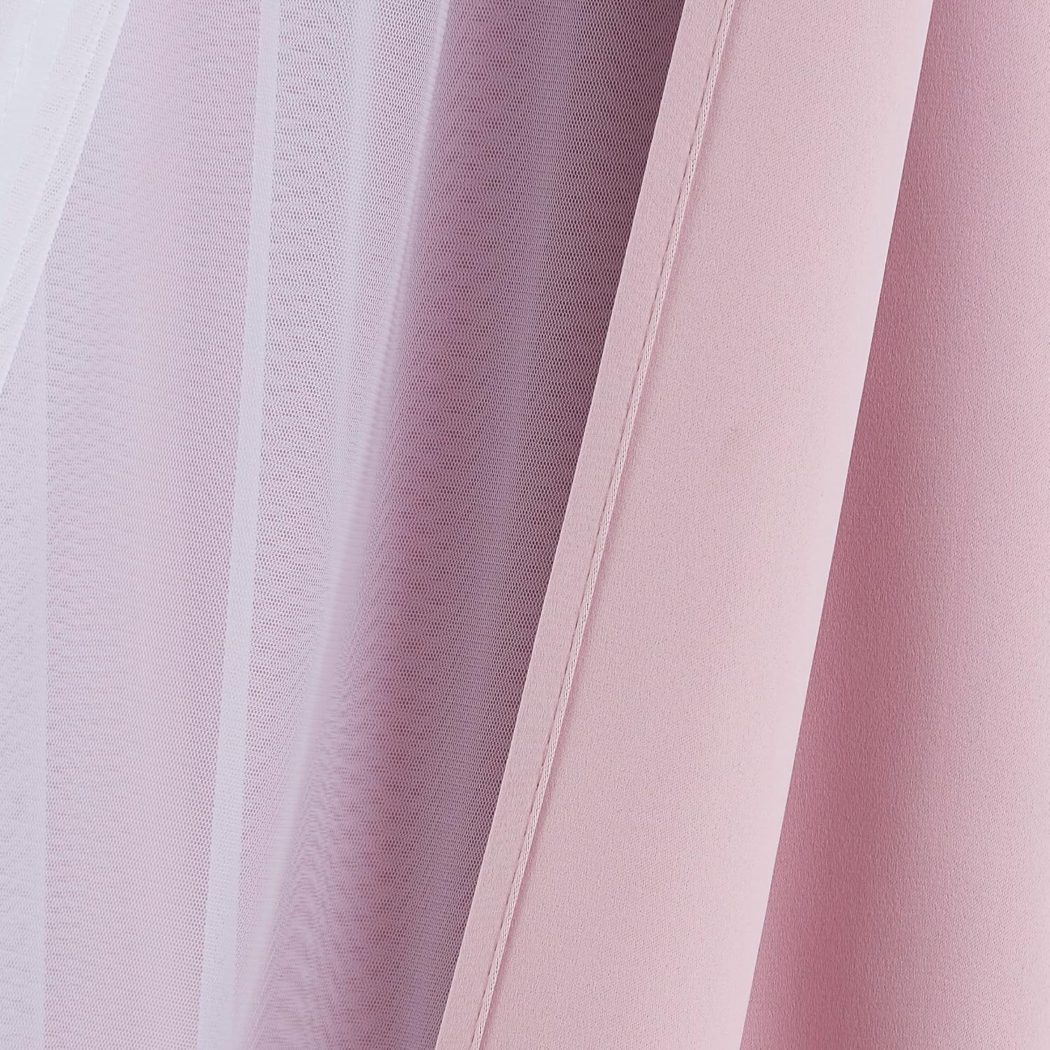 Bujasso Pink Blackout Curtains with Sheer Overlay Mix and Match Double Layer 80% Room Darkening Window Treatment Set for Girls Bedroom Pink Drapes with Tiebacks Rod Pocket Back Tab 37" Wx84 Lx2