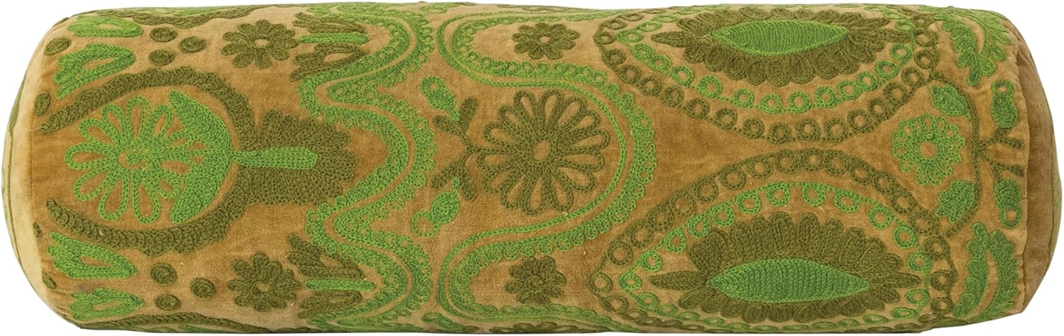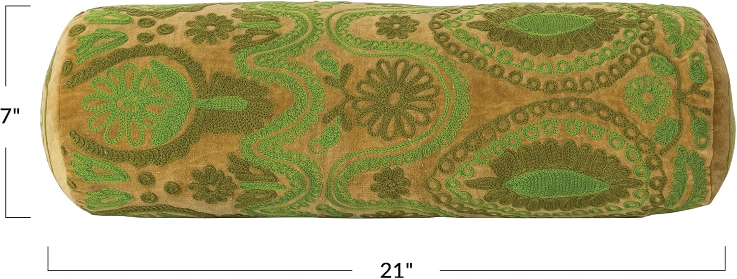 Creative Co-Op Cotton Velvet Embroidered Bolster Pillow, Green