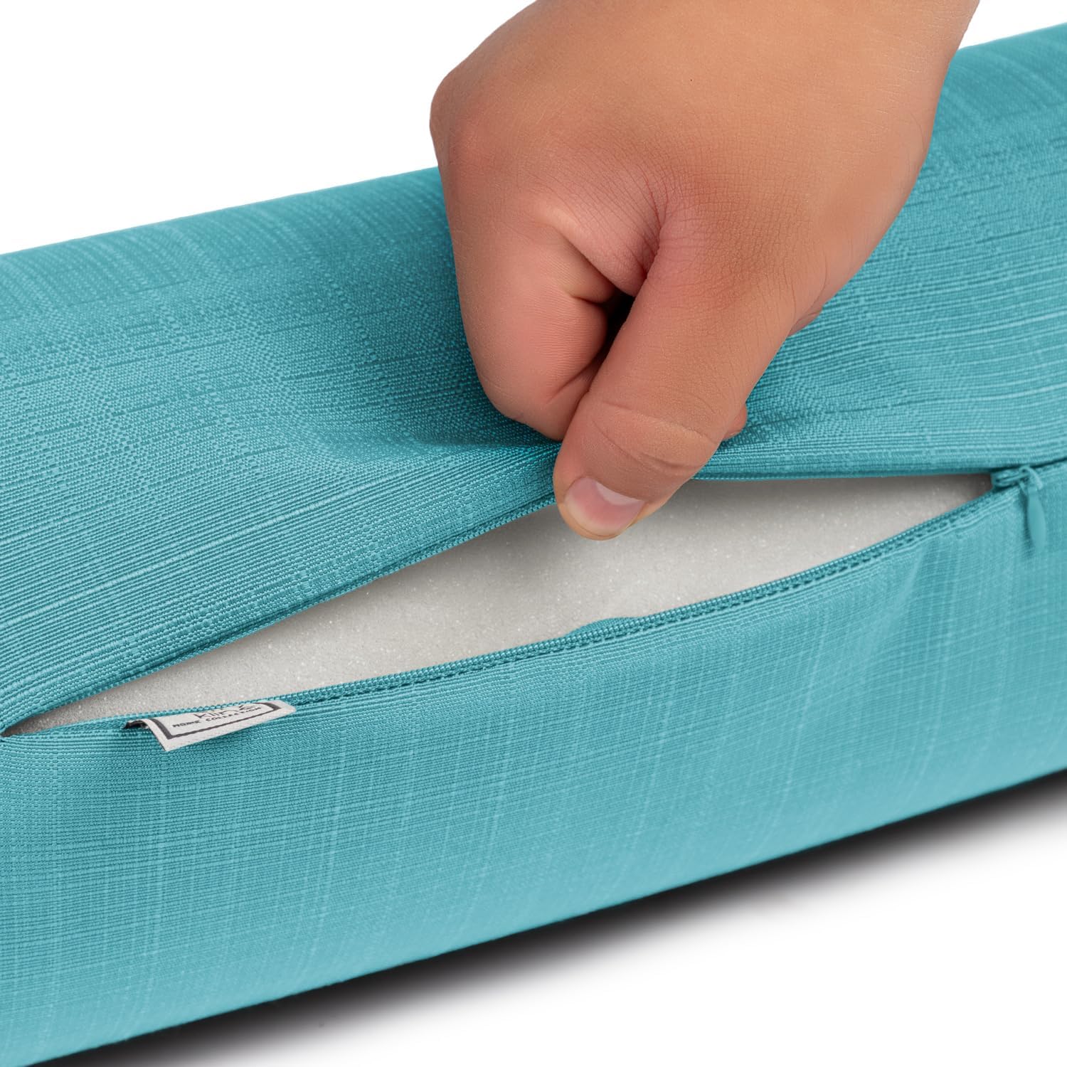 Round neckroll bolster with zipper, cording, and firm foam insert. Removable cover.